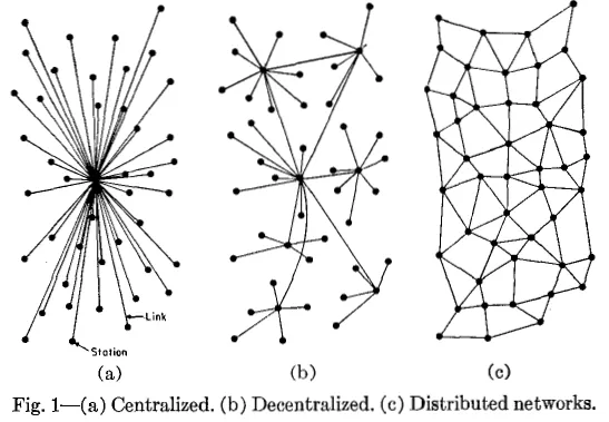 Above is the often used image of the difference between centralized, decentralized, and distributed networks. Despite its ubiquity, it is, in my opinion, a bit inadequate since a and b both describe client/server relationships, and c seems to leave out the client. So imagine that there are clients connecting into the distributed network on the right, and benefitting from all the connections therein.